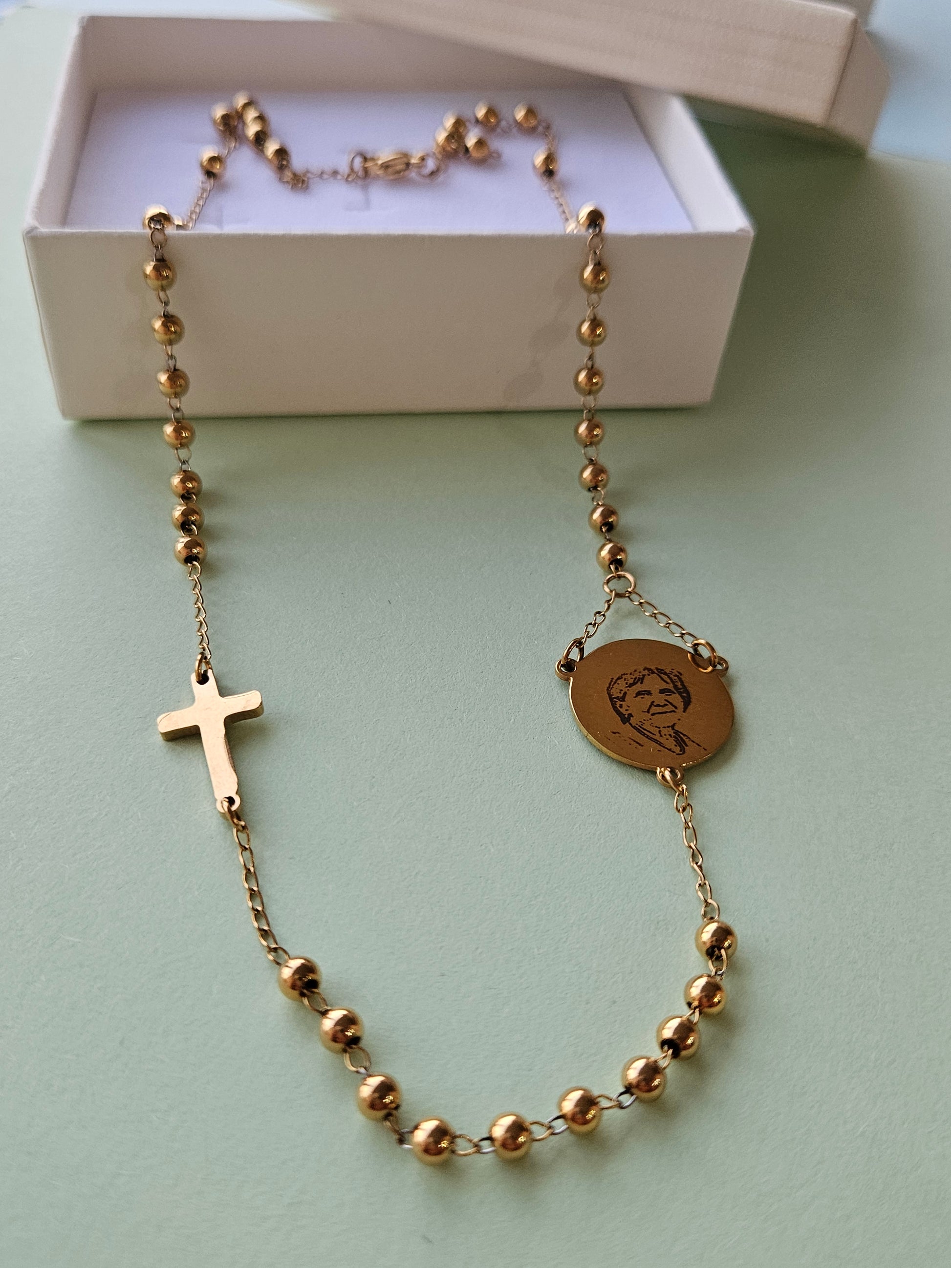 Rosario collier pallina 4 millimetri con fotoincisione su tondo da 20 millimetri in acciaio inossidabile